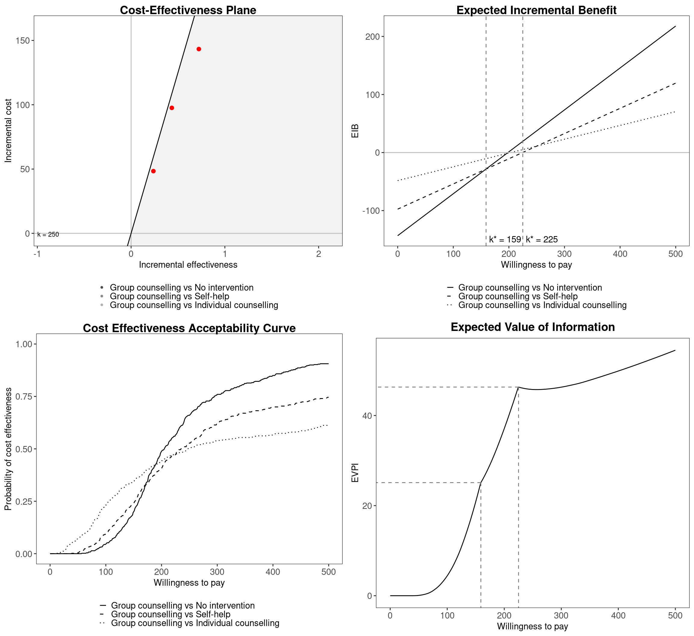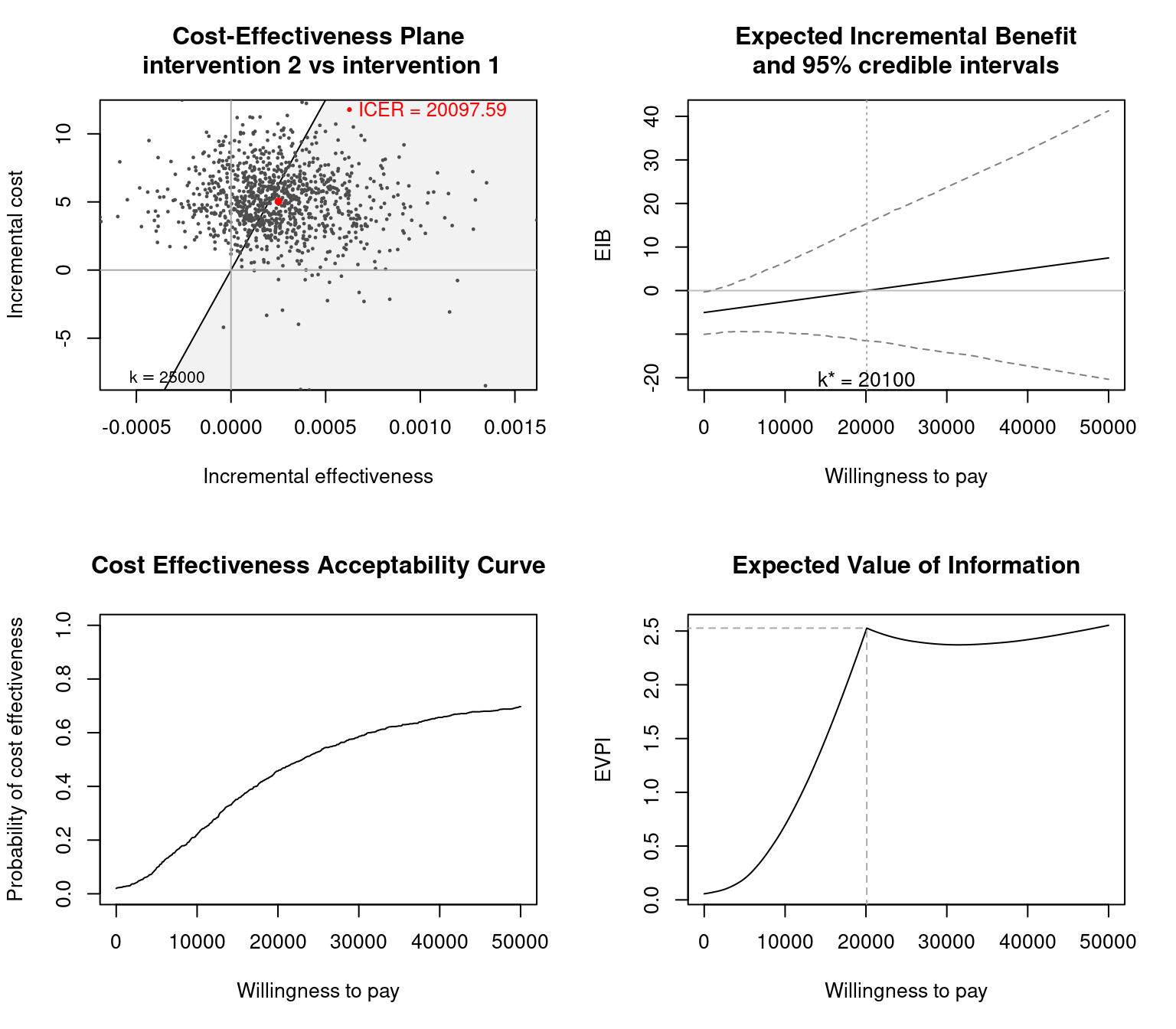 BCEA by setting the option plot=TRUE or by calling the function plot with a valid BCEA object as its argument. From the top-left corner, clockwise, it includes: the cost-effectiveness plane Section 3.4, the expected incremental benefit Section 3.5, the cost-effectiveness acceptability curve Section 4.2.2 and the expected value of perfect information Section 4.3.1.
