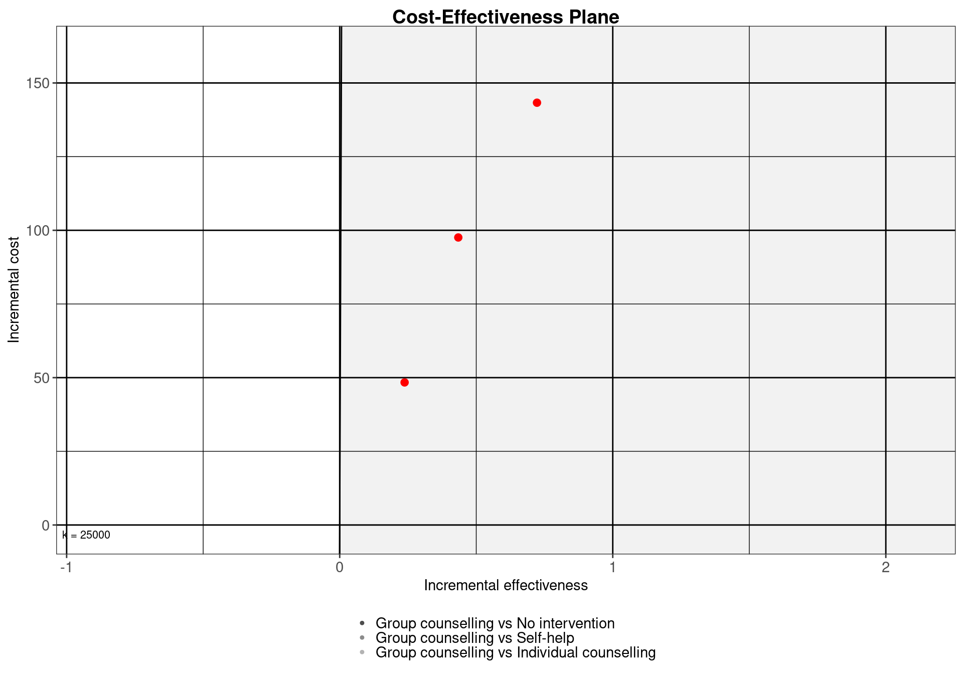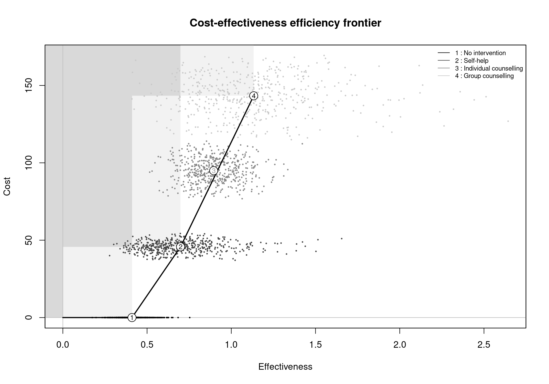 ceef.plot function. The colours of the numbers in the circles indicate if a comparator is included on the efficiency frontier or not. In this case, the interventions No treatment, Self-help and Group counselling are on the frontier. Individual counselling is extendedly dominated by Self-help and Group counselling.