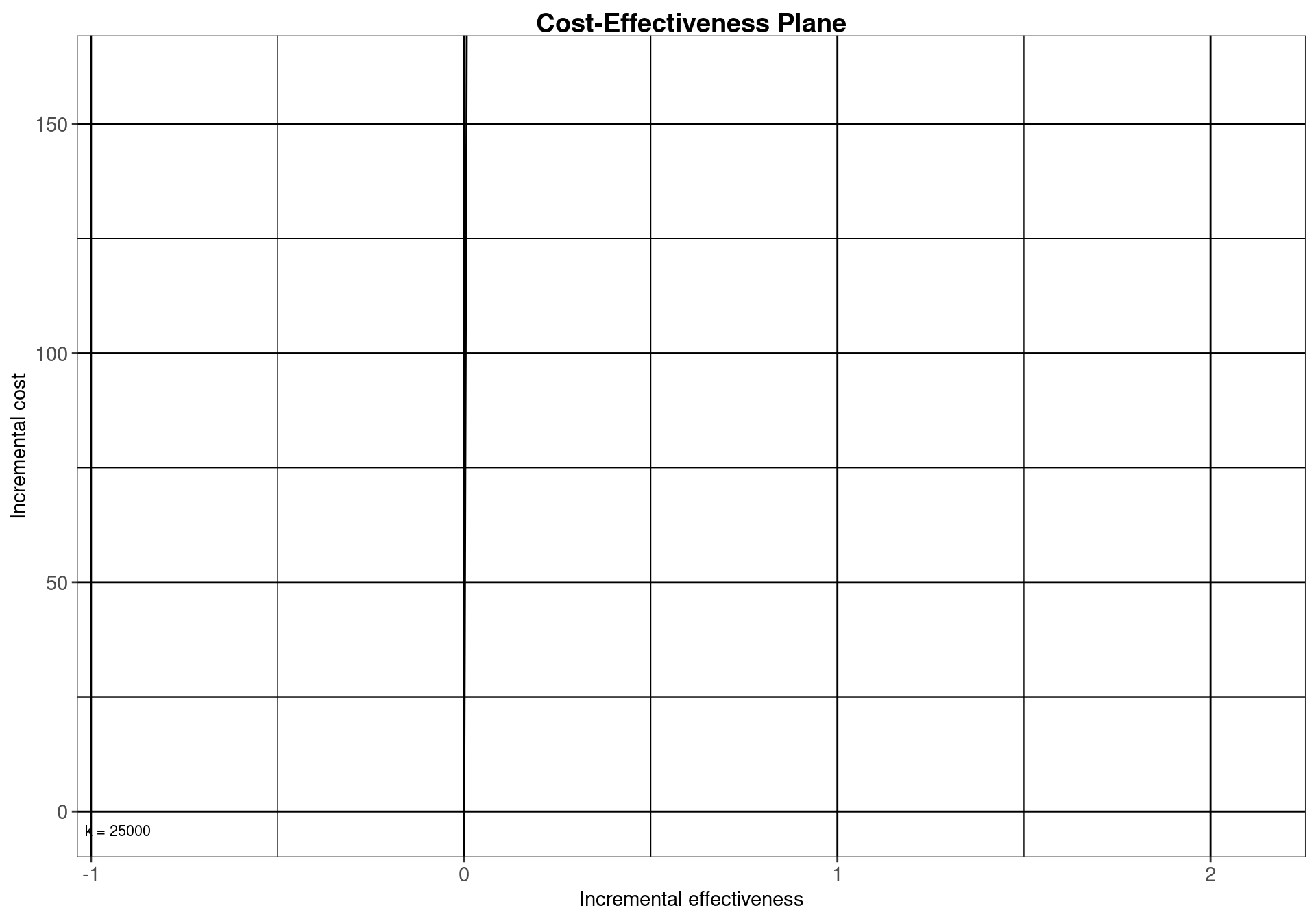 ...Thus it is possible to modify the plot post hoc, by removing, adding or modifying layer elements. For example, to produce a plot of the plane excluding the cost-effectiveness acceptability area it is sufficient to execute the following code, which will produce the plot in Figure 3.8.
