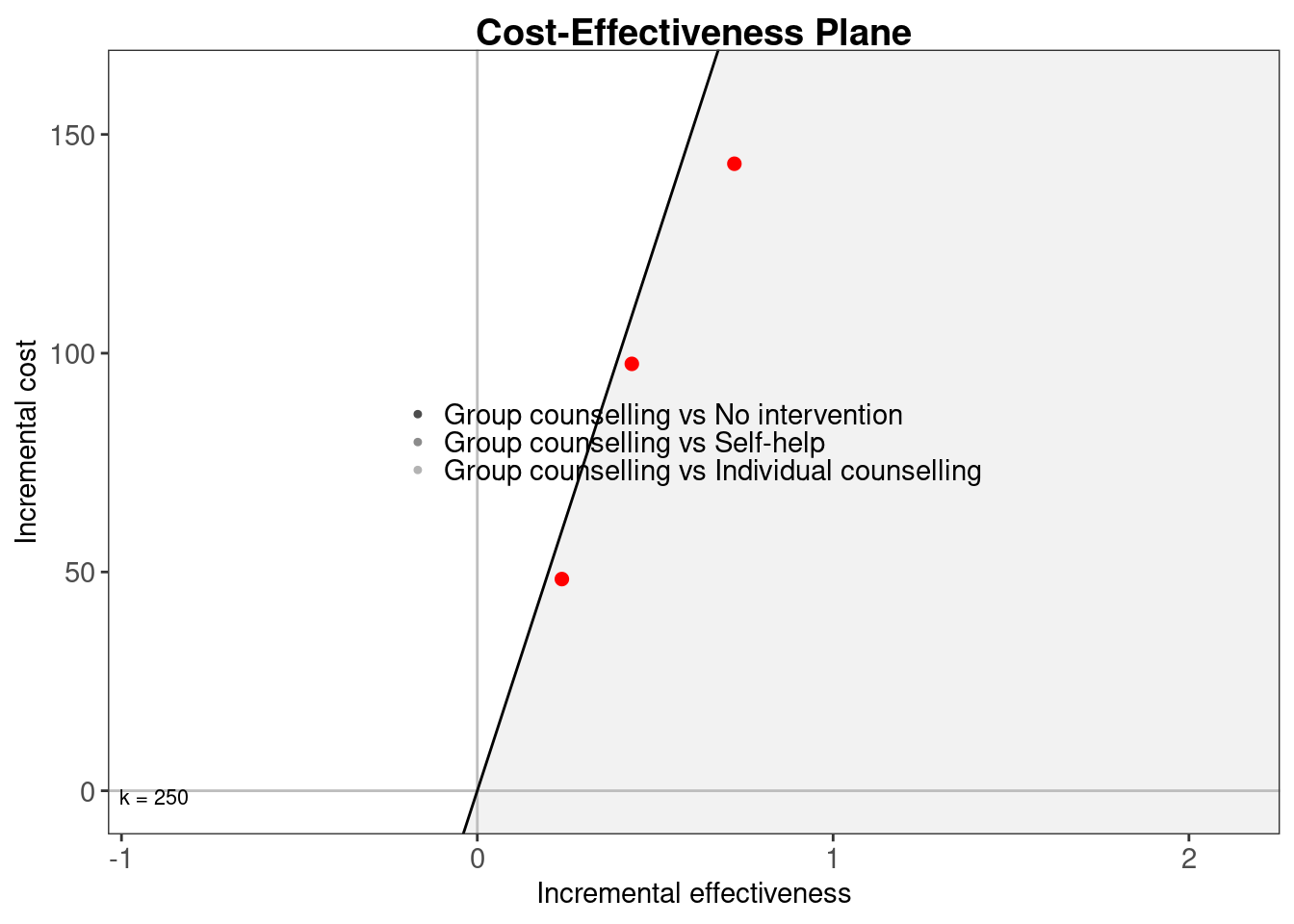 - the dominance regions, shaded in grey. A lighter shade indicates that interventions in that area would be (absolutely) dominated by a single intervention, while multiple interventions would dominate comparators in the area with the darker shade. Comparators in the non-shaded areas between the dominance regions and the efficiency frontier are extended dominated. The graphical representation of the dominance areas can be suppressed by setting dominance=FALSEin the function call.