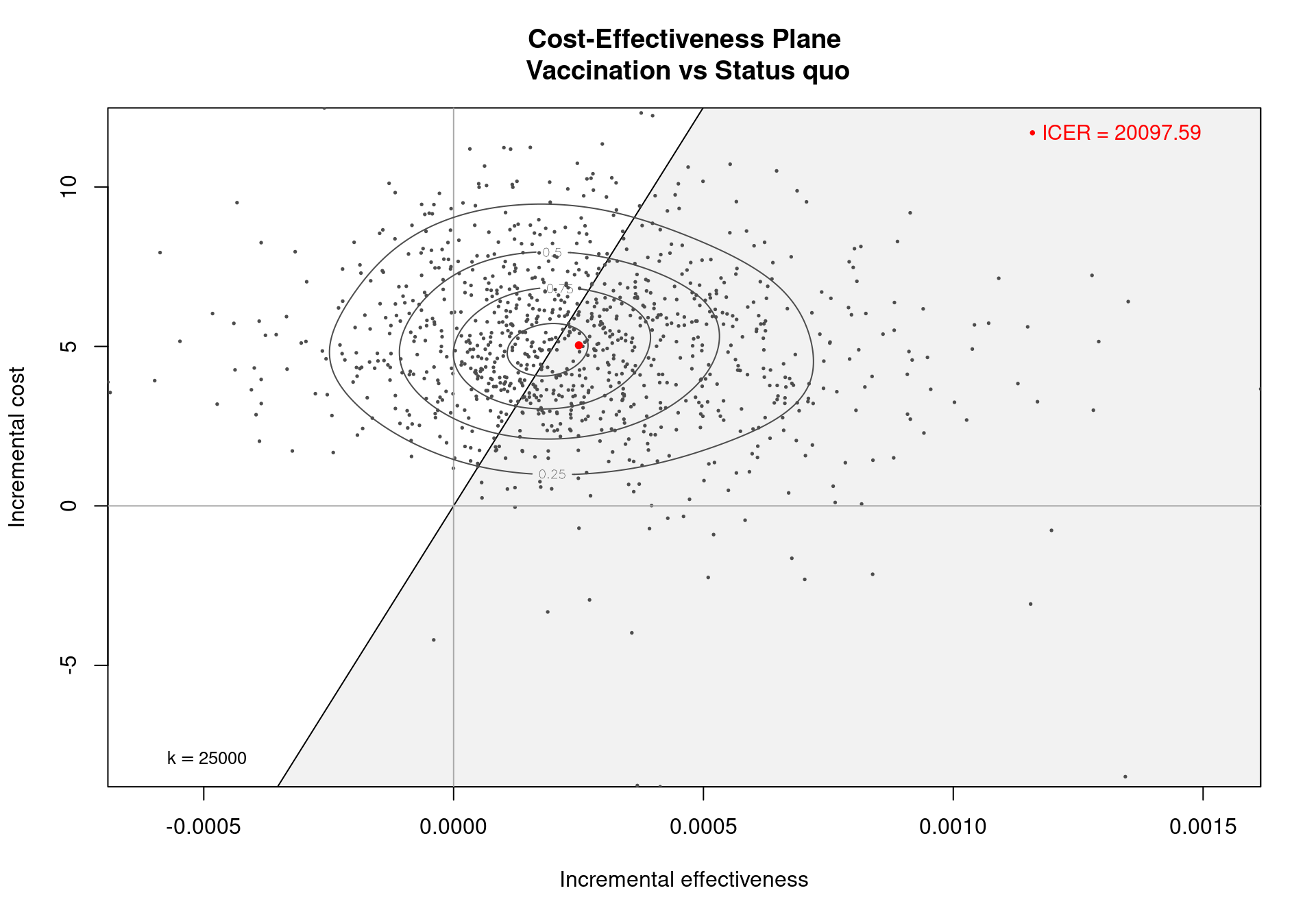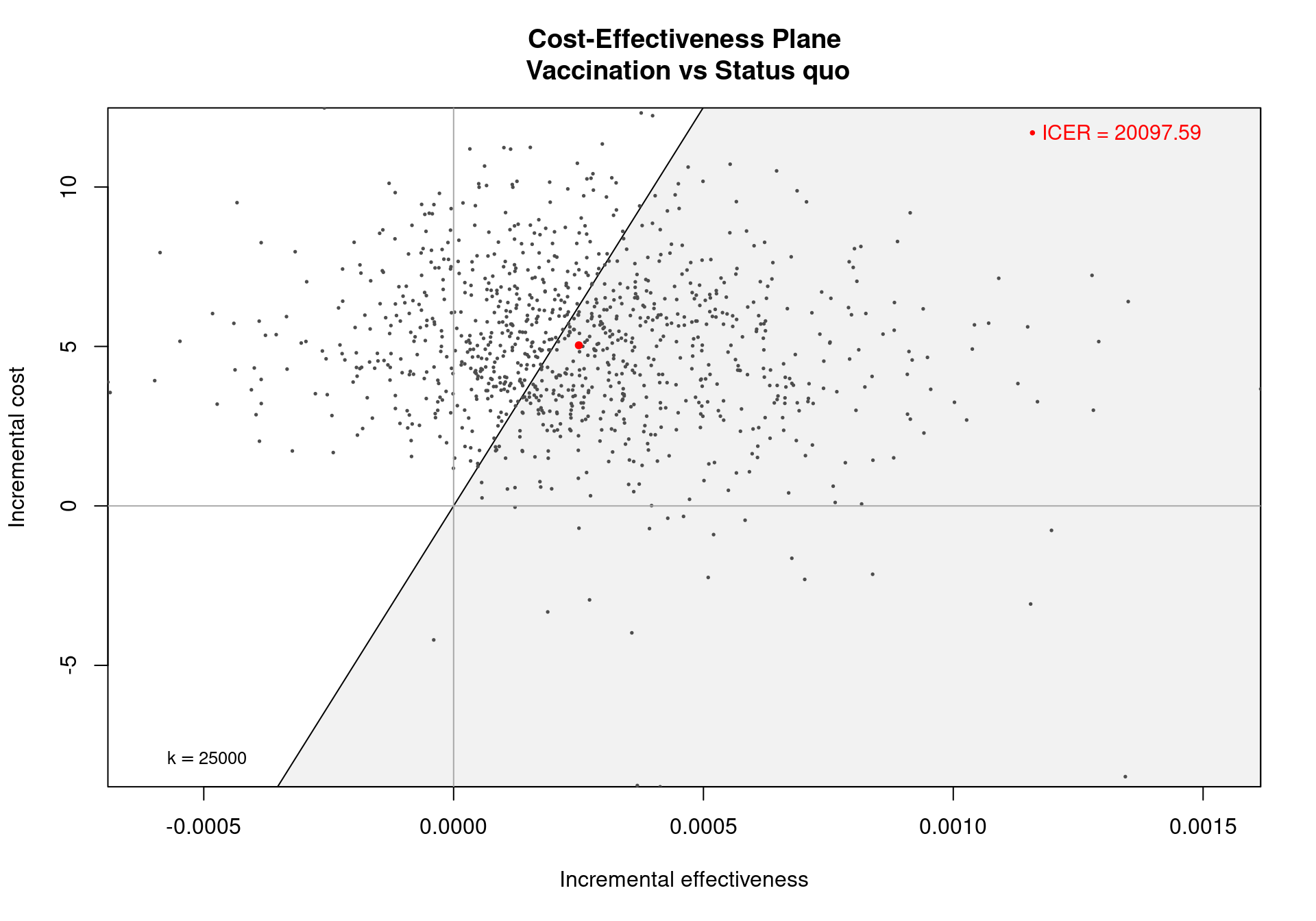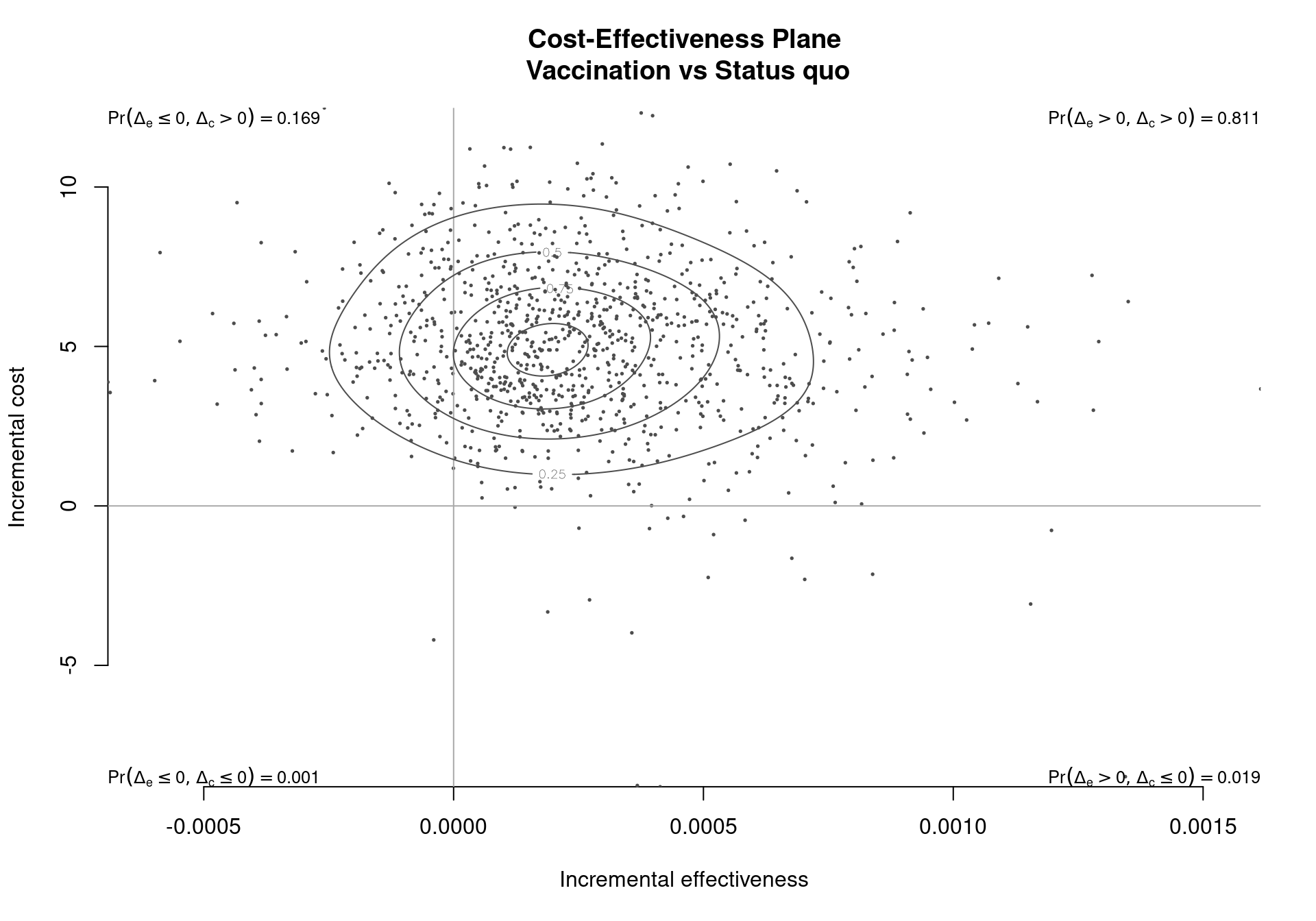 If a single comparison is available or selected, the comparison argument is a single-element vector, the graph indicates the probability of a point (\(i.e.\), the outcome of a future simulation) falling in each of the four quadrants of the cost-effectiveness plane. The probability that the status quo dominates the alternative treatment is equal to the likelihood of a future outcome landing in the north-western quadrant. Alternatively, while the probability of the alternative treatment dominating is the probability of residing in the south eastern quadrant. For example, Figure 3.12 shows the basic results for the Vaccine example; the estimated probability of the vaccination strategy dominating is 0.019, while the probability of the status quo dominating is 0.169.