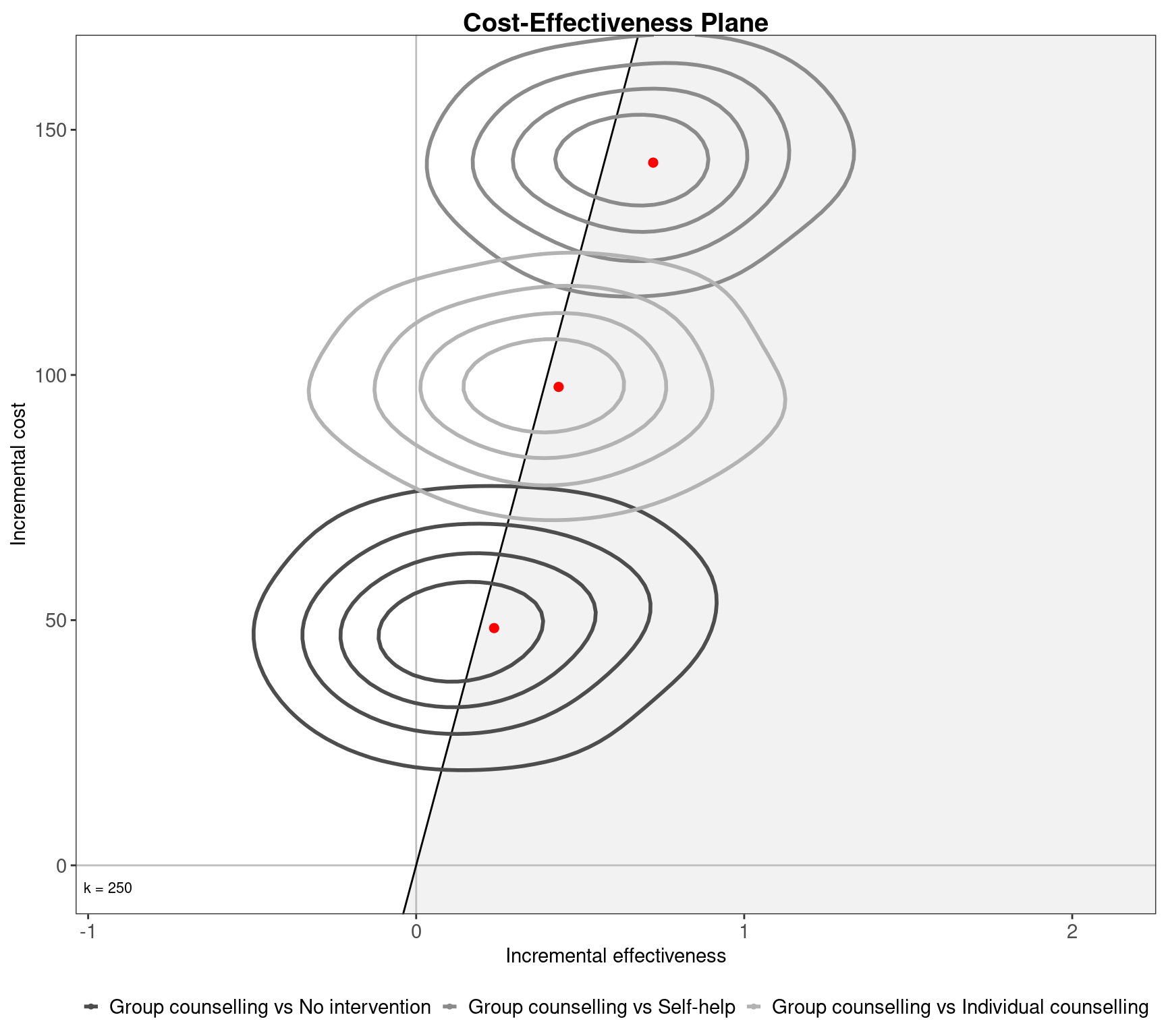 Clearly, this Figure is similar to Figure 3.6, with the additional of the bivariate contours allowing the user to identify the variation in the different comparisons more clearly. Evidently, this version of the contour2 function is able to pass additional values to the ceplane.plot function (\(e.g.\), the arguments pos, ICER_size, label.pos). In addition, both contour and contour2 can be further customised using the same optional arguments that have been described in Section 3.4.3 (that is irrespective of which graphical engine is used to produce the graph).