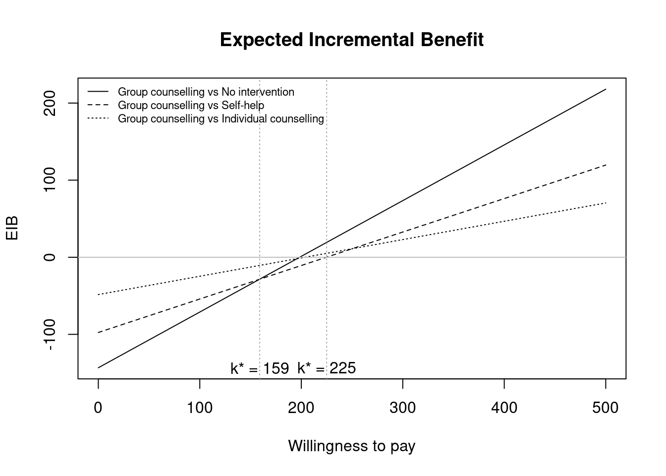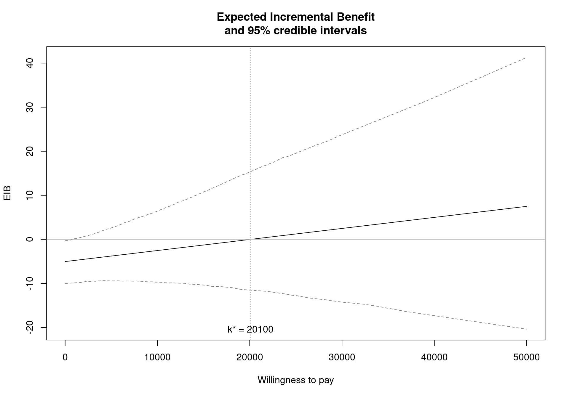 As mentioned in Section 1.3, the EIB can be directly linked with the decision rule applied to the ICER. If a willingness to pay value \(k^*\) exists in correspondence of which \(\mbox{EIB}=0\) this value of \(k\) is called the break-even point. It corresponds to the maximum uncertainty associated with the decision between the two comparators, with equal expected utilities for the two interventions. In other terms, for two willingness to pay values, one greater and one less than \(k^*\), there will be two different optimal decisions.