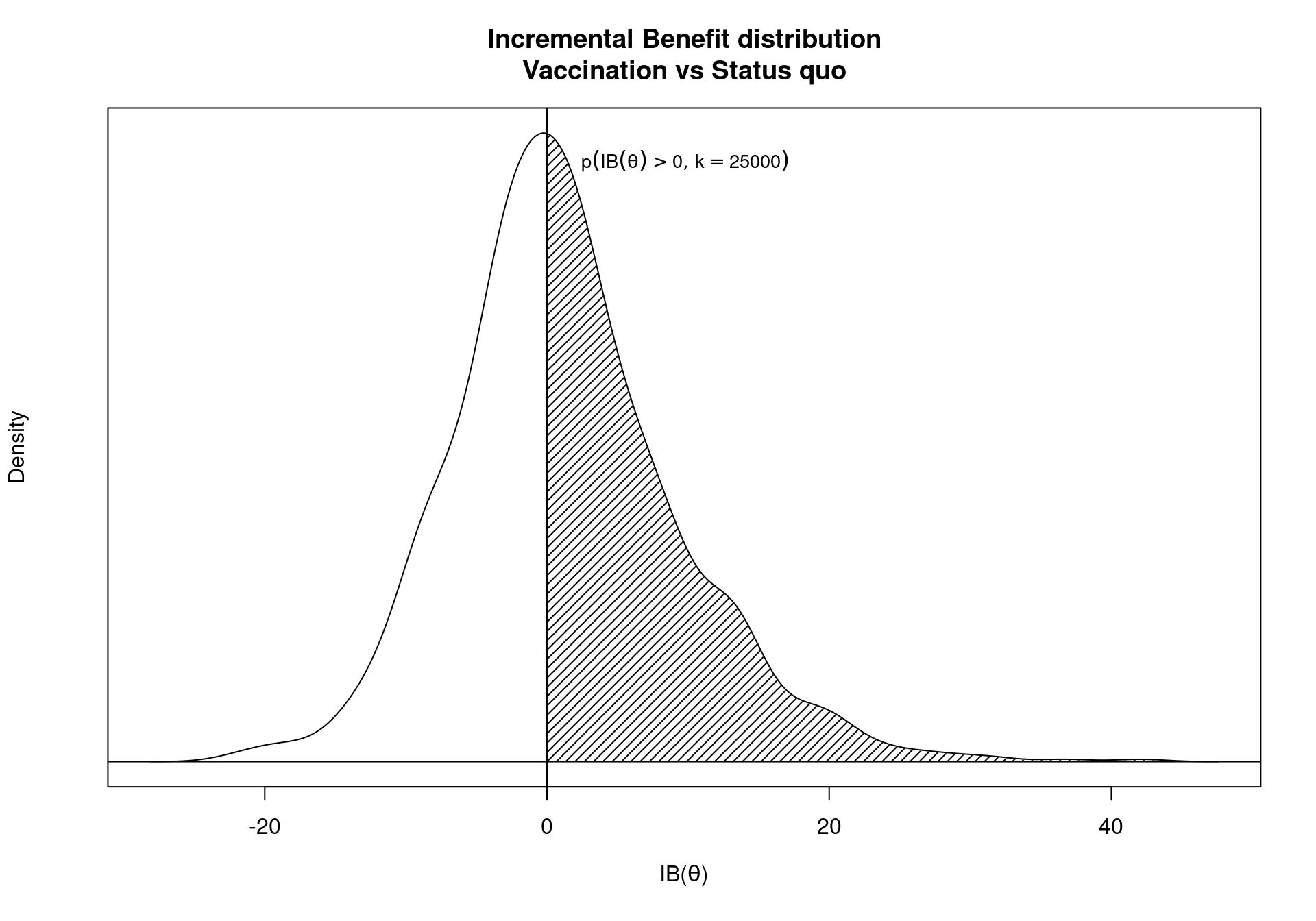 The represented distribution is a Gaussian kernel density approximation of the incremental benefit calculated for each simulation. The kernel estimate can be adjusted using the parameters bw, identifying the kernel smoothing bandwidth, and n, the number of equally spaced points at which the density is to be estimated. These two parameters are passed to the density function available in the stats library. The willingness to pay can be modified by giving a different value the wtp parameter, with \(k=25,000\) as the default. The limits of the \(x\)-axis can be adjusted using the xlim argument, by supplying the lower and upper bound of the axis to be represented as the elements of a two-dimensional vector.