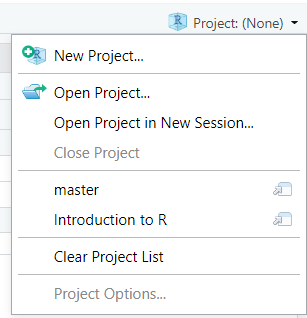 When organising an analysis or developing a model, you may have lots of files within a project folder, including data, multiple analysis scripts, and output figures and tables. Rstudio has a feature called projects that is designed with this in mind. These automatically open the file browser to your project directory, opens up the files you last used in the source pane, and sets your working directory.