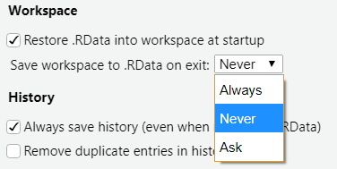 We strongly recommend that you choose Don’t save. Saving your workspace is not reproducible: future results will depend on previously run code, and It is easy to introduce hidden errors or lose work. You can disable this option permanently by going to Tools > Global Options and choosing Save workspace to .RData on exit: Never