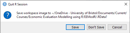 It can sometimes be useful to save, and later load, an R object. For example you may want to save the output from a model or script if it takes a long time to compute, like the results from a large probabilistic Markov model (Chapter 11) or complex network meta-analysis (Chapter 10). This also aids with sharing code and ensuring analyses are reproducible. The probabilistic samples could be saved to your R project and collaborators could run their own post-processing code.