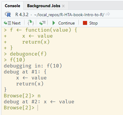 You can then use the console to investigate and run commands within the current state of the function environment, for example to print the current values of variables or to evaluate pieces of code. Rstudio provides buttons above the console pane to control the debugger.