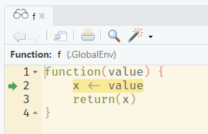 A much more powerful option is to use the debugging tools built-in to R and Rstudio. If you run debugonce(fun) before calling the function fun, you can “step inside” the function whilst it runs and investigate line-by-line. Alternatively, place a call to browser() in your function at the line where you want to “step in”. The debugged function will be opened in the source pane, and the line that will be executed next by R is highlighted:
