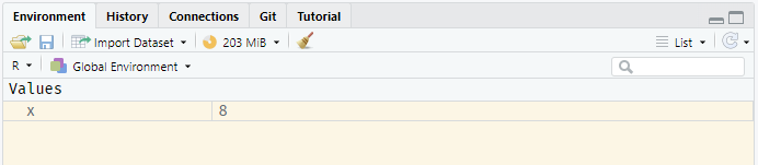 x <- 2^3This assigns the result of 2^3 to the variable x; you will notice that this is now visible in the environment pane in the top-right of Rstudio.