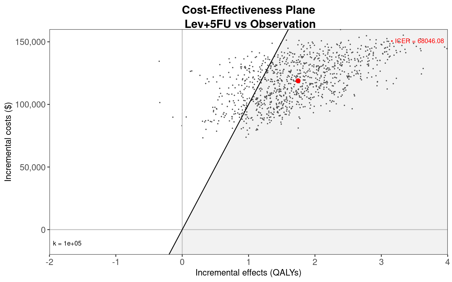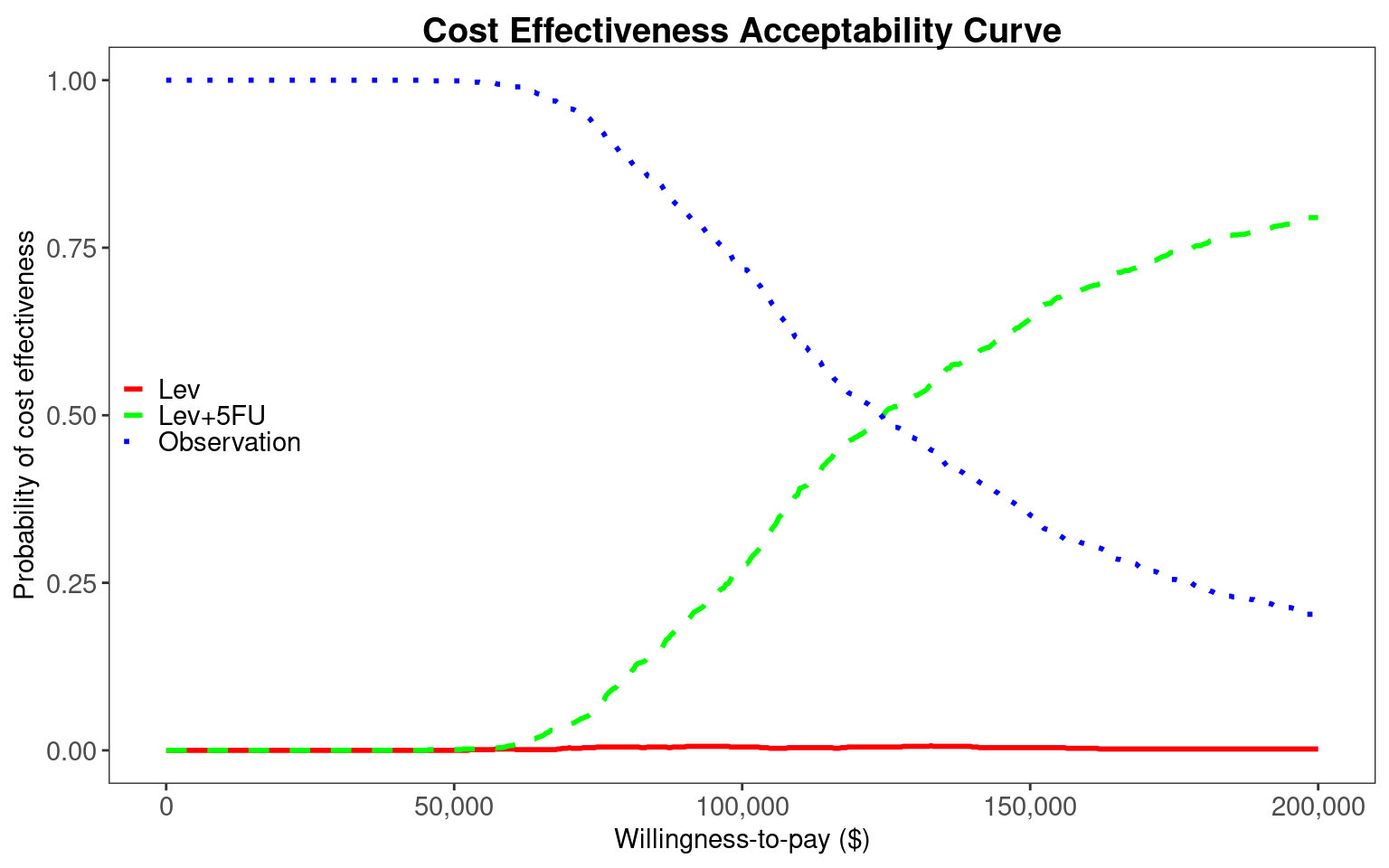 In the $50,000/QALY to $100,000/QALY range, Lev+5FU is again the most cost-effective intervention and it has the highest expected net benefit at $100,000/QALY.