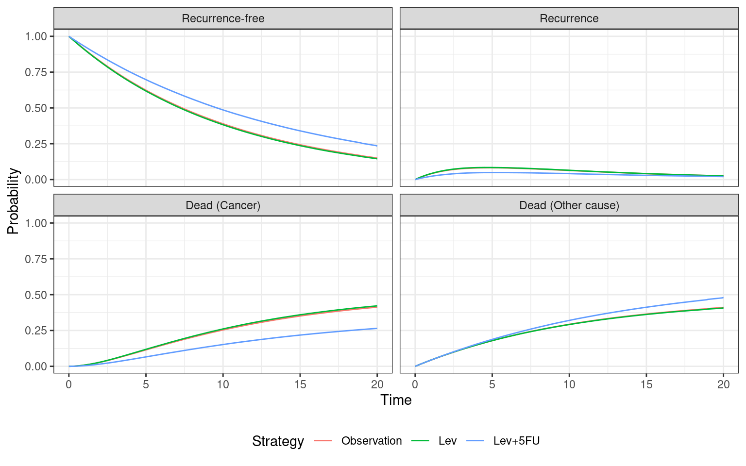 economic_model_panel$sim_stateprobs(t = seq(0, 20 , 1/12)) Given the differences between models (i.e., fully-observed vs panel data, non-constant hazards vs exponential, clock-reset vs clock-forward) it is interesting to first compare the estimated state probabilities. We see that differences between treatments are much less pronounced, due to the more limited data and lack of flexibility in the exponential survival models. However, Lev+5FU individuals spend marginally more time in the recurrence-free state and have a slightly lower rate of cancer death.