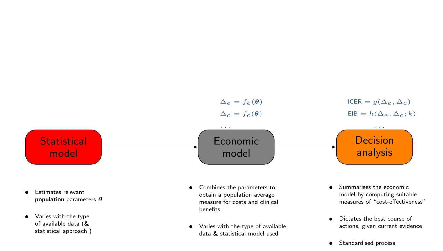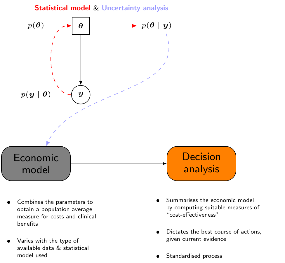 The straight path from the “Statistical model” to the “Decision analysis” represents the decision-making process given current evidence and conditionally on the assumptions made in the statistical analysis
