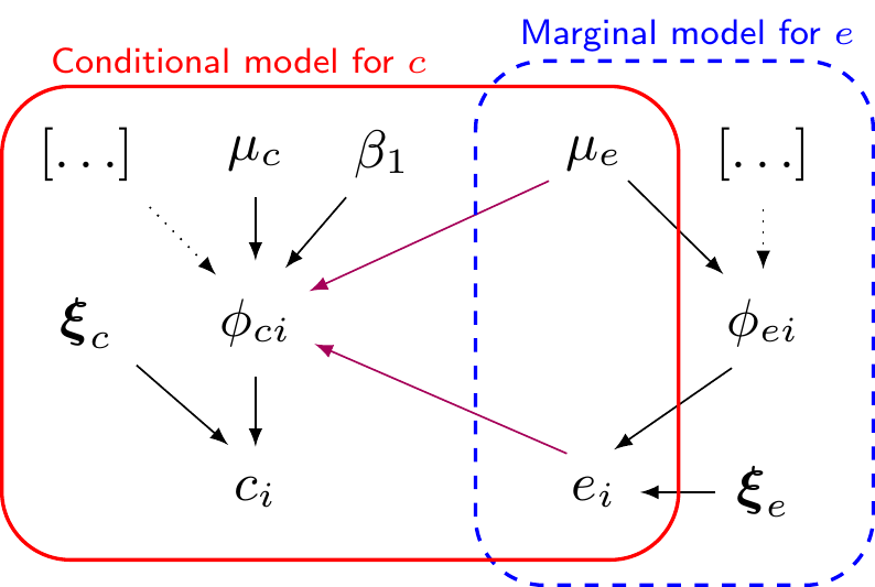 \[\left( \begin{array}{c} \varepsilon_{ei} \\ \varepsilon_{ci}\end{array} \right) \sim \dnorm\left( \left(\begin{array}{c} 0 \\ 0\end{array}\right), \left(\begin{array}{cc} \sigma^2_e & \rho\sigma_e\sigma_c \\ & \sigma^2_c \end{array}\right) \right)\]