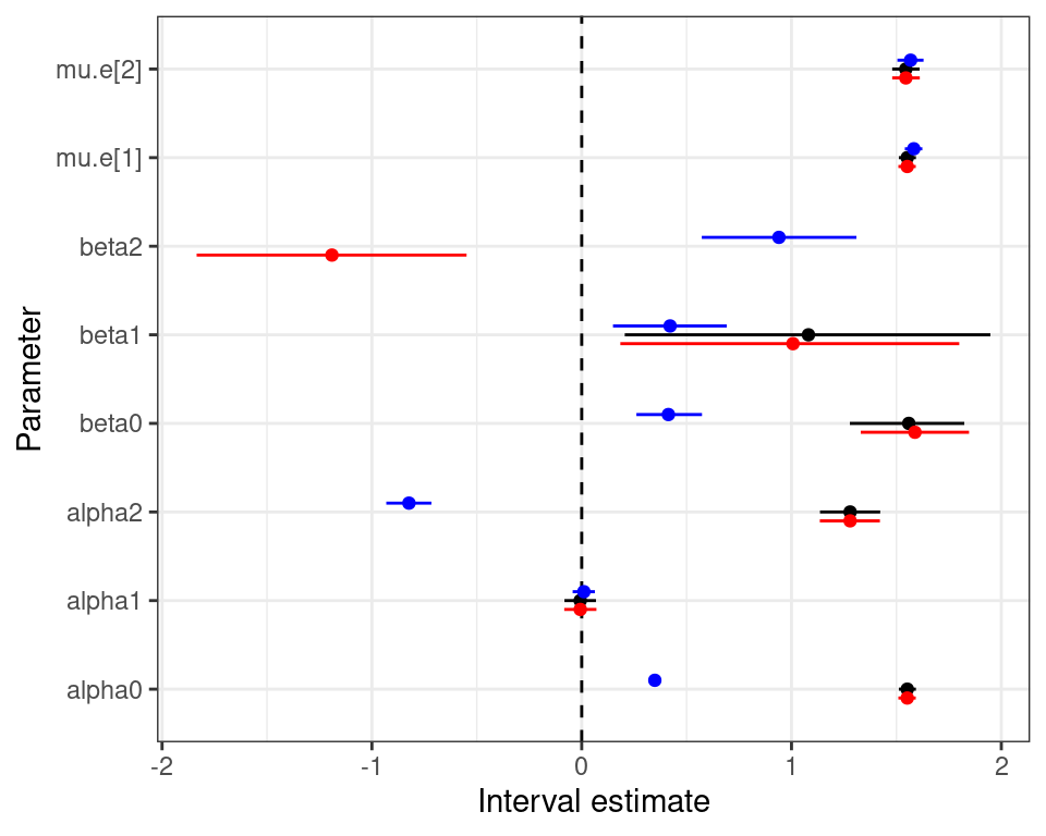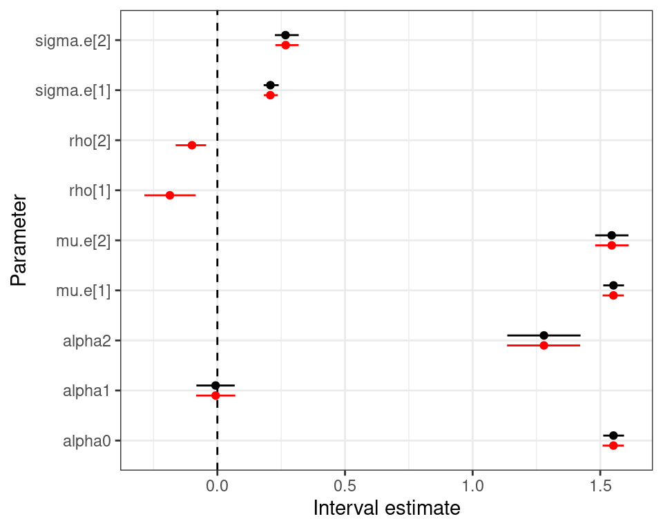 e_i & = \alpha_{e0} + \alpha_{e1} \text{Trt}_i + \alpha_{e2} u^*_{0i} + \varepsilon_{ei}\, [+ \ldots], \qquad \varepsilon_{ei} \sim \dnorm(0,\sigma_e) \\