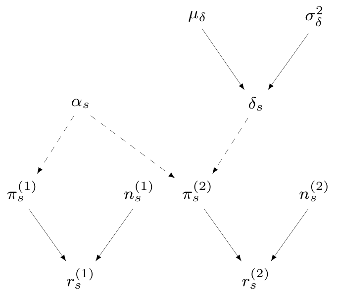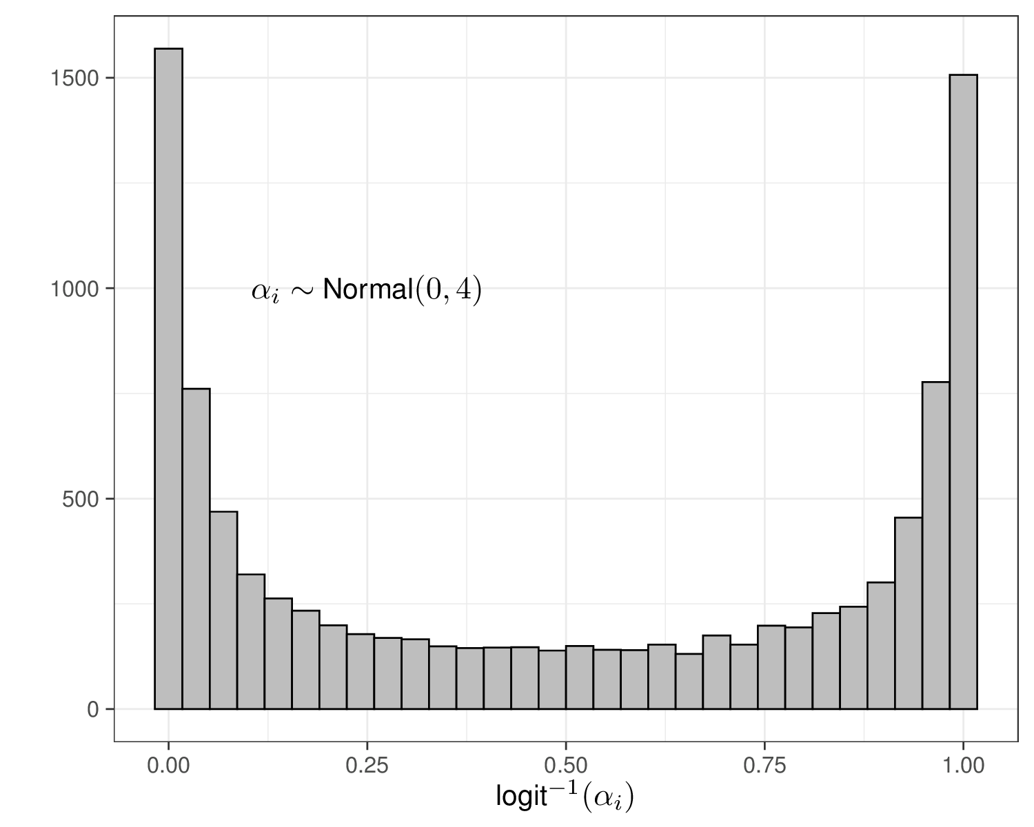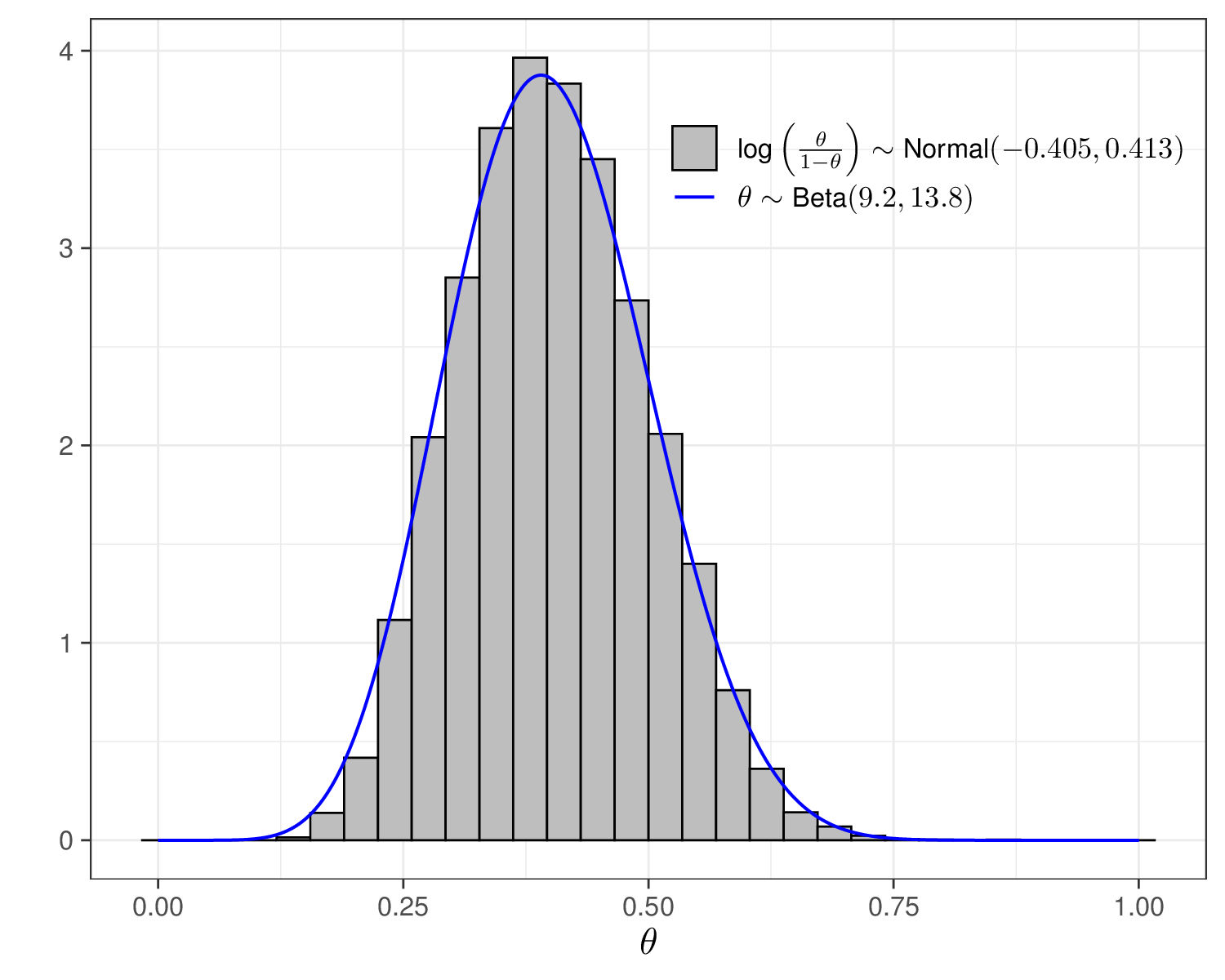 - from a Bayesian perspective, this does not pose a substantial problem, because once we obtain simulations from the posterior distribution for \(\alpha_0\) and \(\beta_0\), it is possible to simply rescale them to obtain samples from the posterior distribution of \(\mu_e\) and \(\mu_c\)