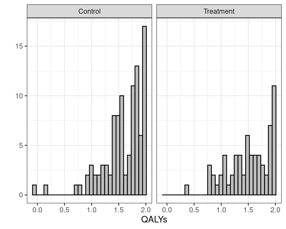 - Can use a Gamma distribution, accounting for a small number of individuals are associated with negative QALYs, indicating a very poor health state (“worse than death”)